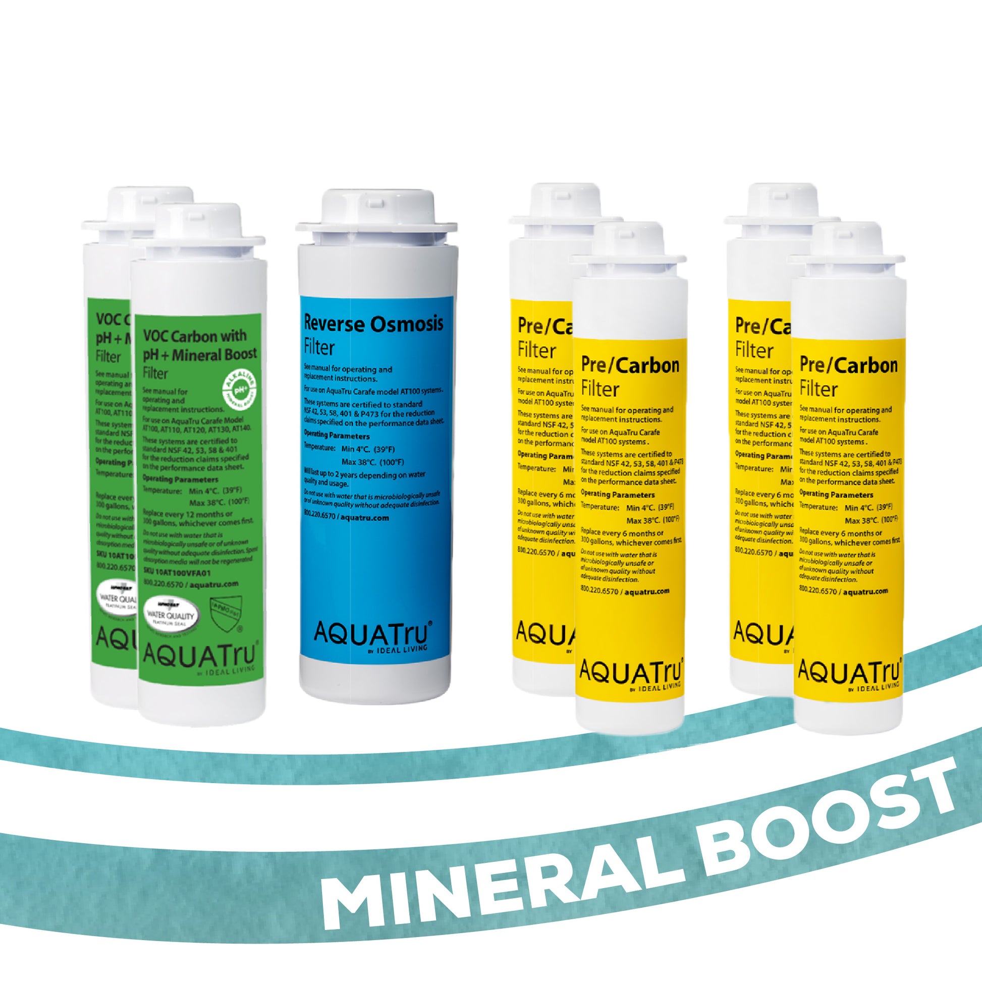 This package includes all the filters you'll need for up to two years after purchasing your AquaTru Carafe Alkaline. It contains 4 pre-carbon filters (1-2), 2 VOC carbon filters with pH+ mineral boost (4), and 1 reverse osmosis filter (3), specially designed for AquaTru Carafe Alkaline. The pre-carbon filter needs to be replaced every six months and is responsible for removing bacteria, sediment, and other large particles. The activated carbon also eliminates any chlorine taste from the water. The reverse osmosis filter is designed to filter even the smallest harmful substances from the tap water. This filter only needs to be replaced once every two years or after filtering 2270 liters of water, depending on which comes first. The VOC carbon filter with pH+ mineral boost removes the remaining impurities, adds healthy minerals, and alkalizes your drinking water. This package provides you with enough supplies for 2 years.