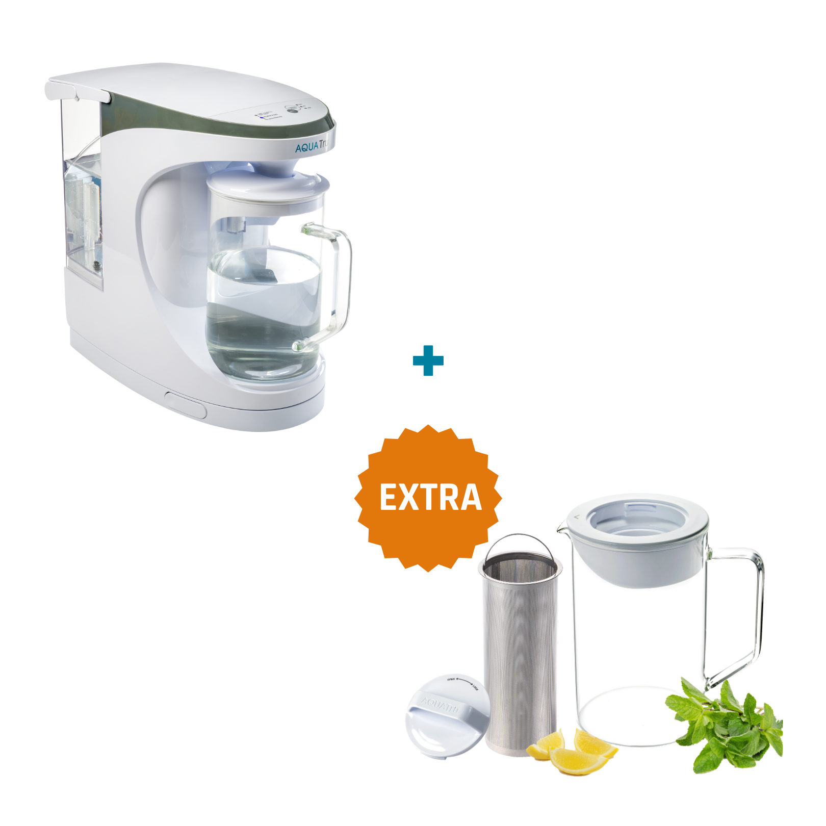 AquaTru Carafe + extra Carafe is a compact water filtration system with a durable and easily removable glass water carafe that fits in the refrigerator. The complete set comes with an extra water carafe with a lid and aroma filter. With this, you can easily enrich your freshly purified water with herbs such as mint or fruits like lemon. AquaTru Carafe filters through a 4-stage filtration, removing more than 99% of all contaminants from tap water. AquaTru Carafe is easy to use: 'Plug & Play.' In other words, plug it into the power outlet, fill the water tank, and within minutes, your water is filtered into fresh and pure drinking water.